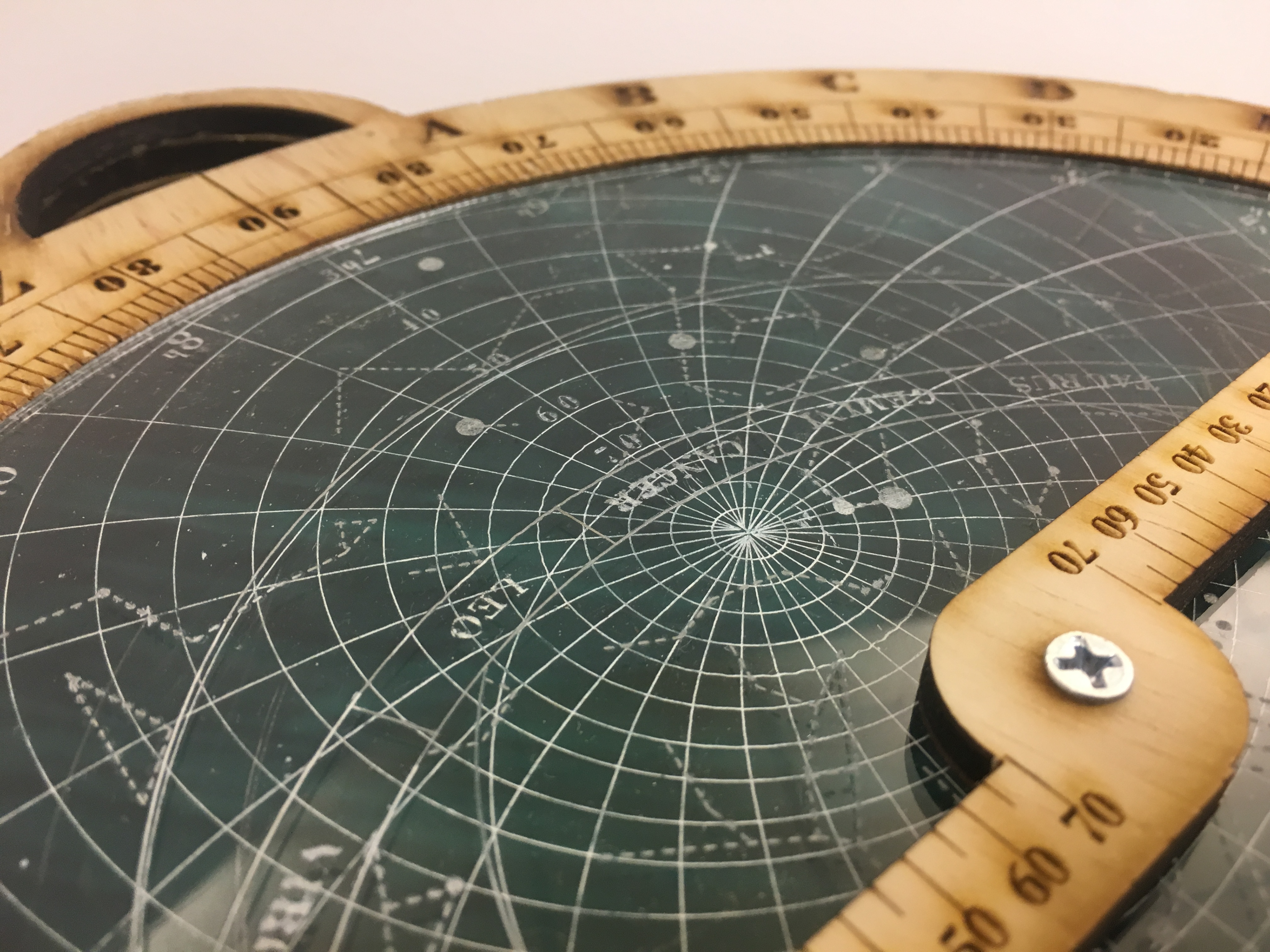 To pay homage to this long past, I wanted to maintain a nostalgic feel by having the entire exterior of the Astrolabe have a flush wooden feel. I then inlaid the acrylic and laser cut the azimuth and altitude lines to give an effect that would not have been able to have been replicated at the dawn of Astrolabes. I attempted to image trace and manipulate a previous astrolabe design, however this turned out to be far more difficult than I anticipated so instead we hand drew all of the design in illustrator. This gave us a great appreciation for early Astrolabe creators who would have needed to precisely mill and manufacture these devices by hand with absolute precision.